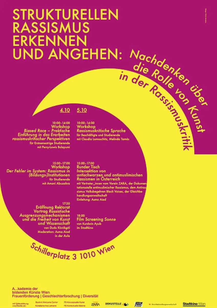 With this 2 days long colloquium on October 4th and 5th, 2022 at Schillerplatz titled „Reflecting on the Role of Contemporary Art and Culture in the Critique of Racism“ including workshops, lectures, round tables and film screenings we’ve targeted the university environment asking for forms of action, relationships and practices that expose and oppose structural racism in the educational system.